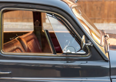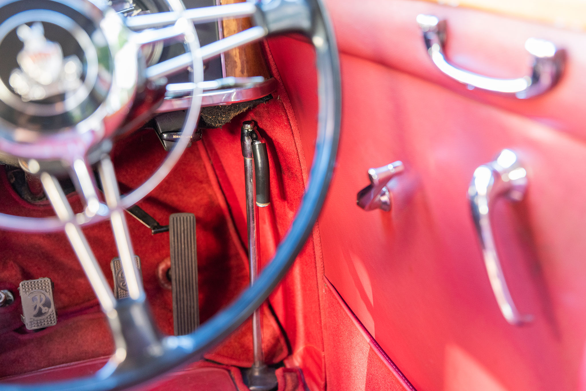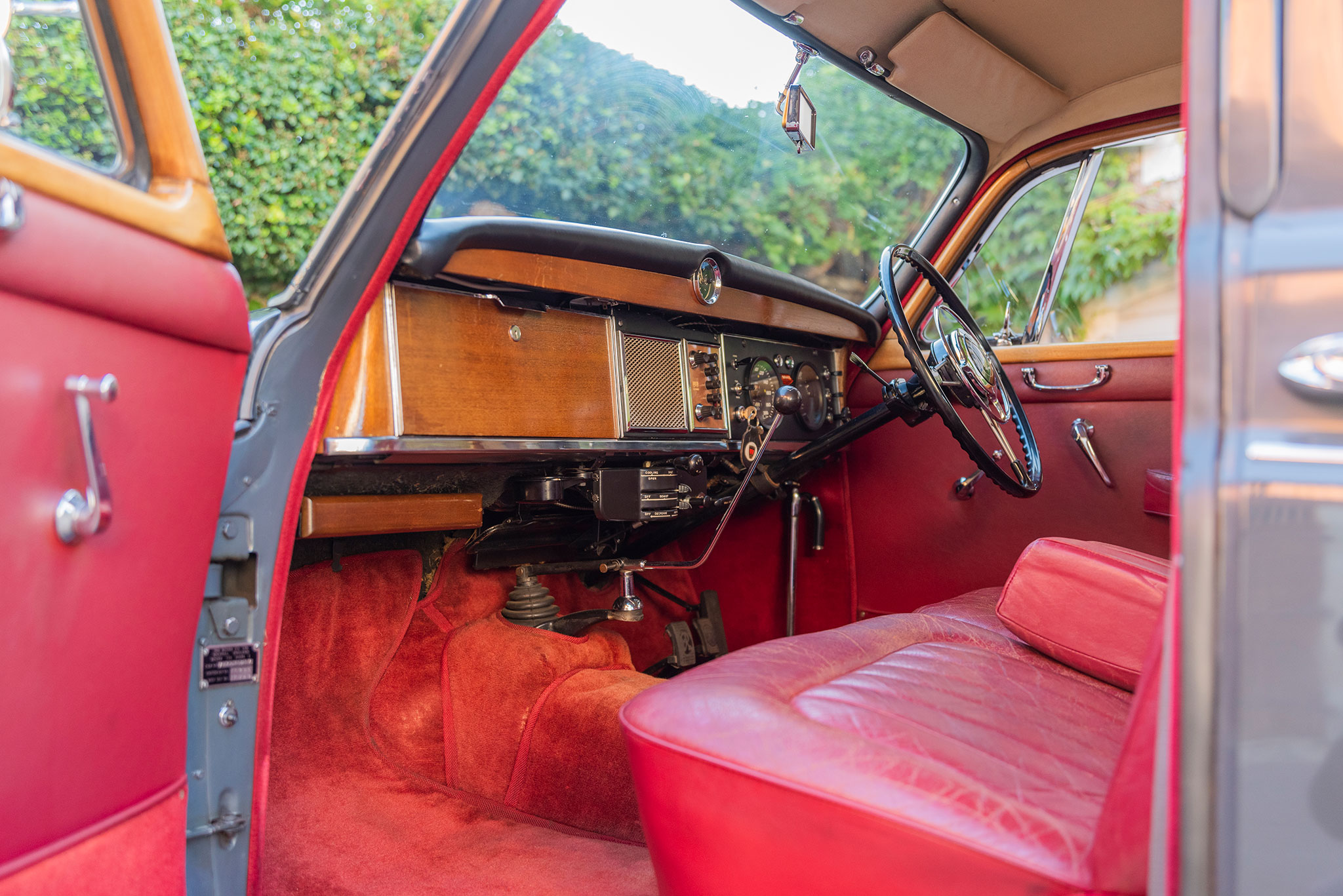 Notre voiture d’essai se présente dans une livrée gris foncé agrémentée de chromes. Son intérieur en cuir rouge est rehaussé de boiseries. Indispensable dans une voiture anglaise. L’insigne du capot avec son viking au casque ailé surmontant un drakkar, se retrouve aussi au centre du volant. Son moteur de 2625 cm³ développe 123 chevaux à 5000 tr/mn. C’est la plus puissante des Rover P4. Elle est dans son état d’origine. Jamais restaurée. La patine de sa carrosserie, tout comme celle de ses cuirs, est parfaite. Aucun point de rouille n’apparaît.