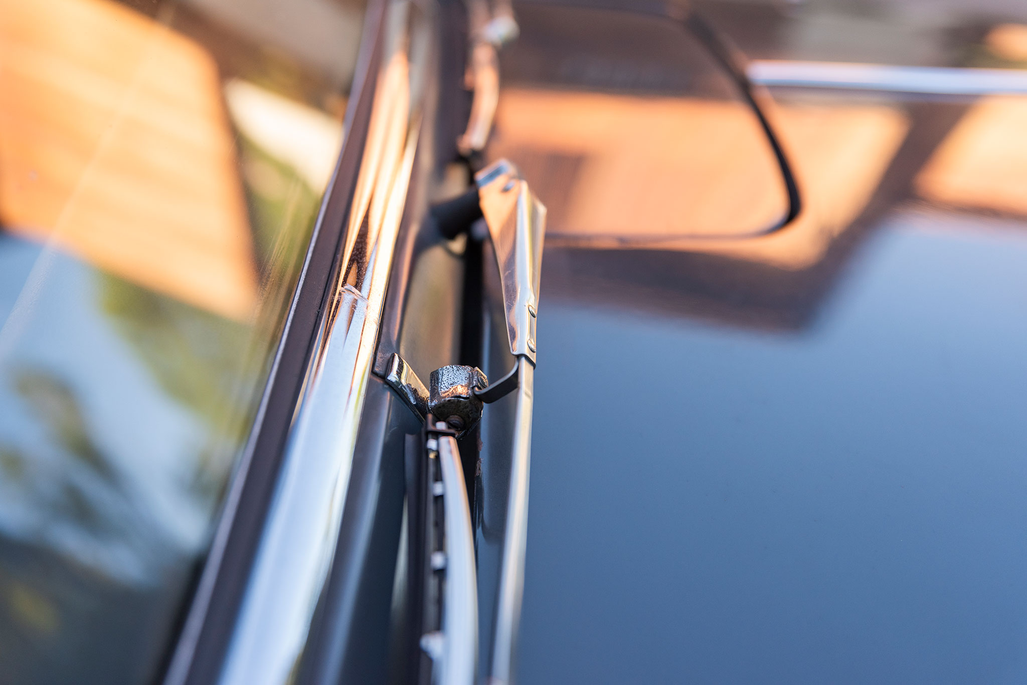 1963 Rover P4 110 – Le chrome est largement présent et la vitre elle-même possède un support chromé.