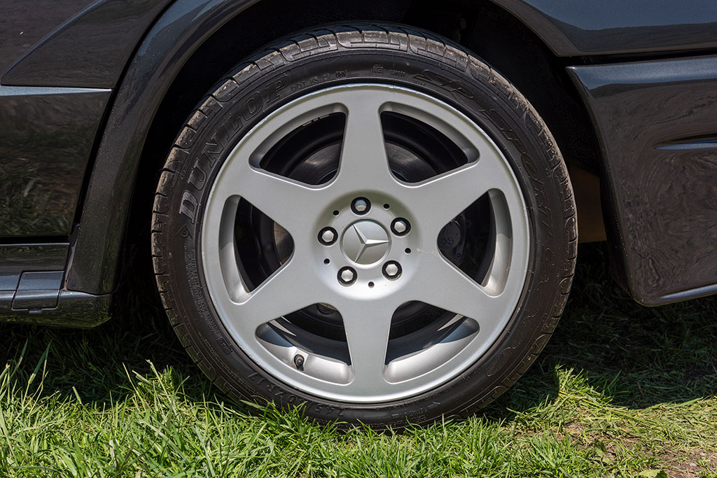 Pour mieux coller à la route, la Mercedes-Benz 190 E 2.5-16 EVO II reçoit des raidisseurs et des jantes de 17 pouces. Et puis celui qui vous saute aux yeux tout de suite : l’imposant aileron arrière. Afin d’améliorer la force d’appui, l’aileron possède un volet rétractable sur la traverse supérieure. De plus, la bande inférieure de l’aileron pouvait aussi être inclinée. Un travail aérodynamique incroyable développé par Rüdiger Faul et Richard Läpple.
