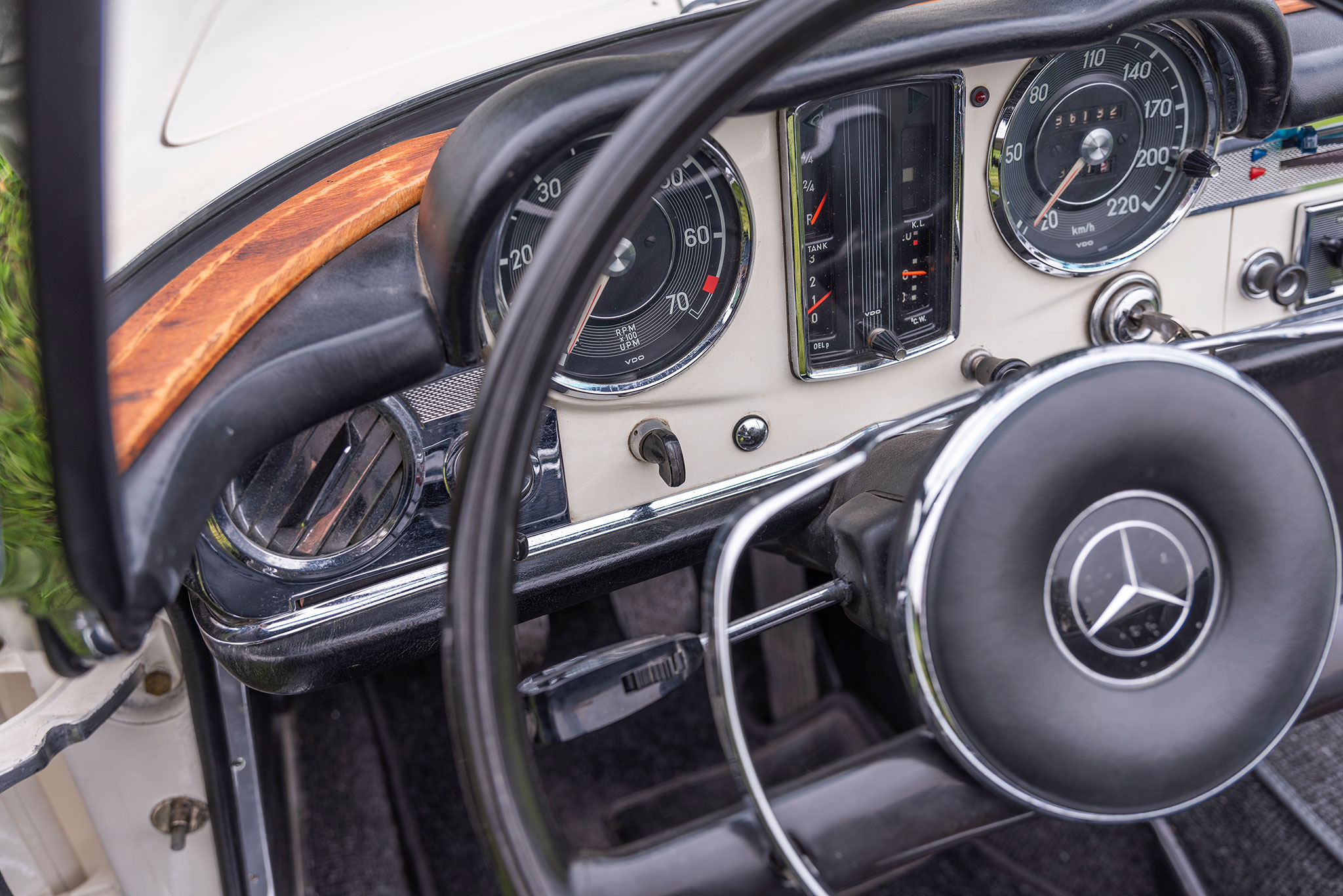 Qui pourrait croire que cette merveille a été fabriquée en 1966. L’extérieur est impeccable. La peinture ivoire tranche sur les nombreux chromes. Le hardtop en forme de pagode vient d’être enlevé. Apparemment, il pèse son petit poids. L’intérieur se dévoile d’un coup. Sièges en cuir noir, de même que les garnitures de portes. Le tableau de bord est assorti à la carrosserie. Serions-nous les premiers à nous asseoir dans ce véhicule ? Tout semble neuf. Ouvrons la portière et installons-nous. Ceinture de sécurité, mais pas d’appuie-tête. Je suis déstabilisée, du coup, je n’accroche pas la ceinture. Je ne sais pas si c’est bien. Le siège est très confortable et j’ai largement la place d’allonger les jambes. La boîte à gants est assez petite, mais il y a un espace de rangement dans la portière.