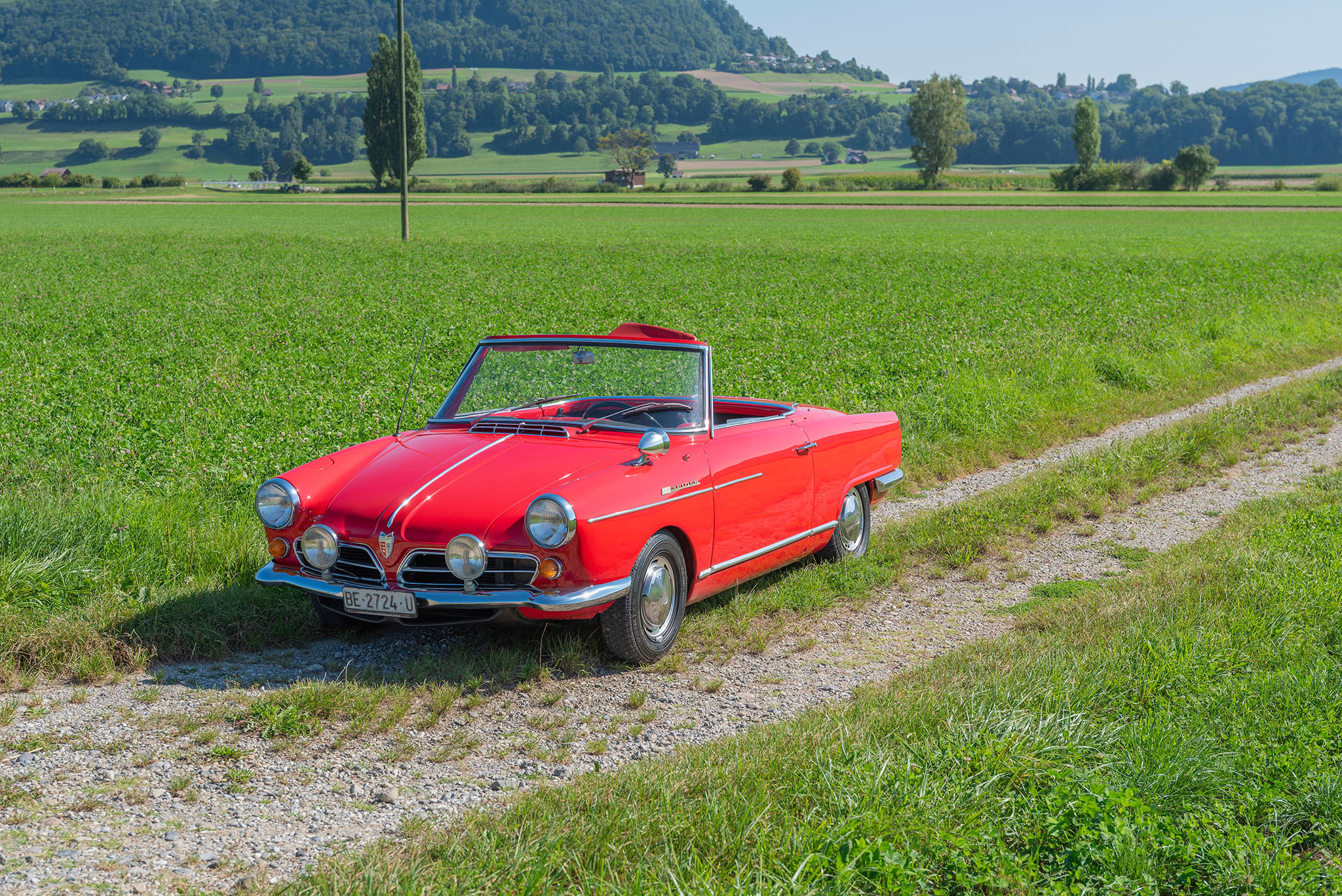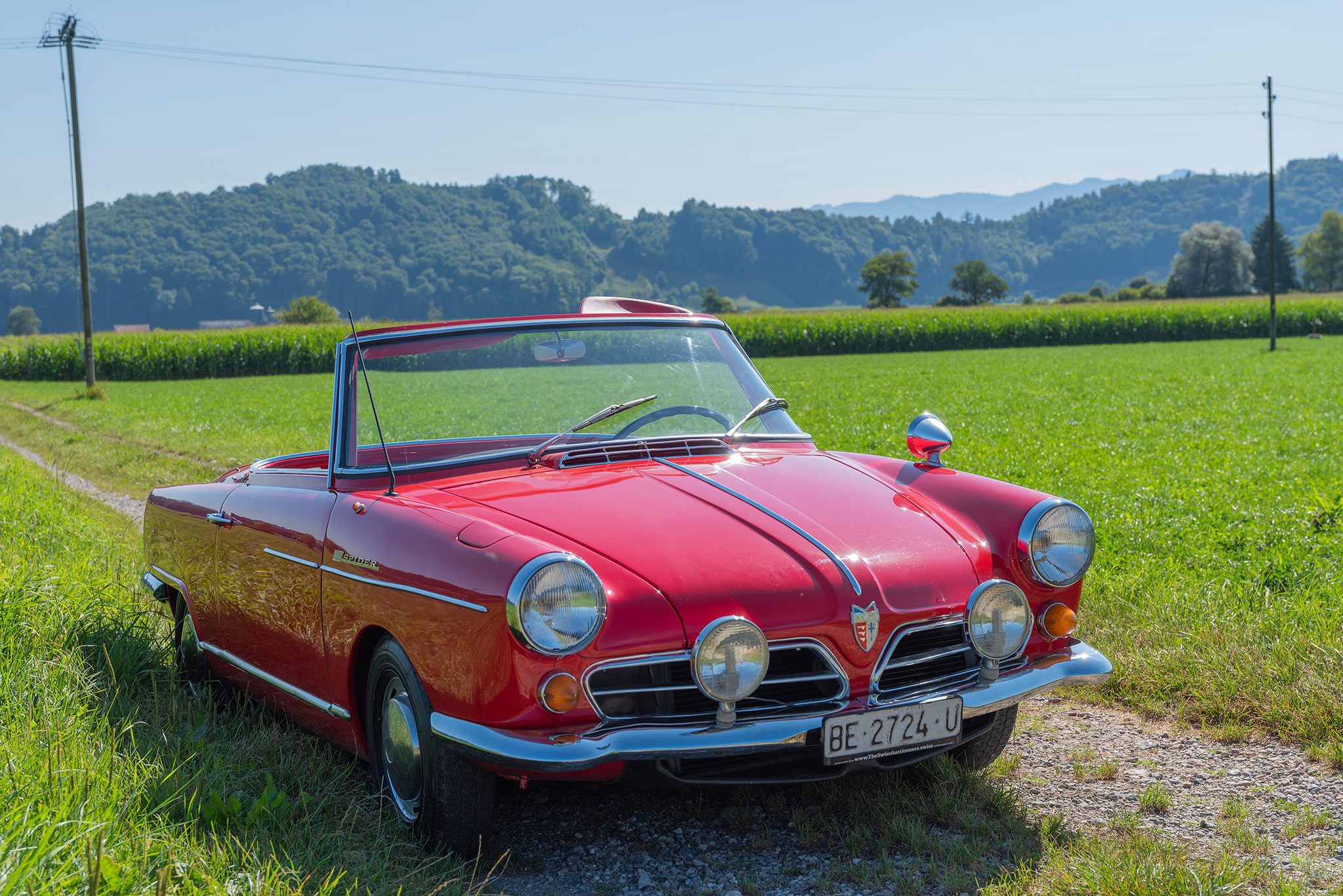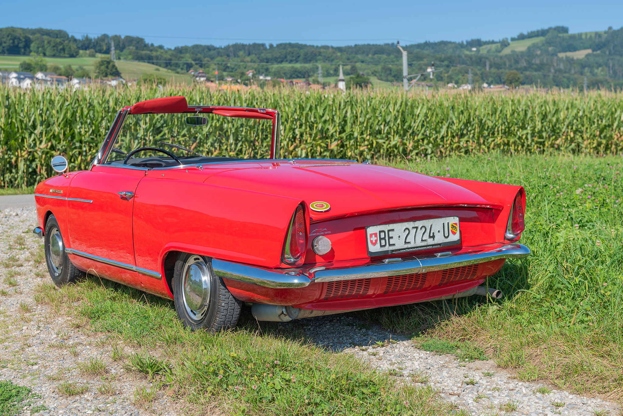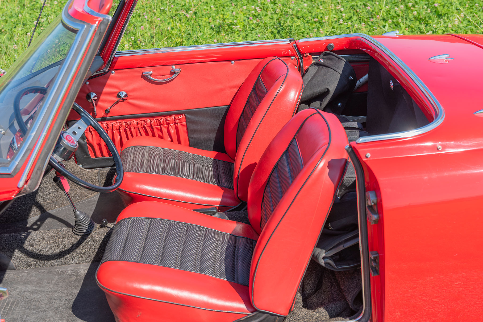 J’avoue, je n’avais jamais entendu parler de cette auto. Au premier coup d’œil, son allure sportive me séduit et m’inquiète à la fois. Ses petits phares ronds me rassurent. Ce petit bolide se présente décapoté, rouge de pied en cape. Courageuse mais pas téméraire, c’est ma devise, je m’imagine déjà collée sur la route, mon petit cœur affolé. Je m’installe (en vrai, me laisse tomber sur le siège bas). L’intérieur est spartiate. On oublie les ceintures et les appuie-tête, années 60 obligent. Le miroir de courtoisie a vu trop de choses et la boîte à gants porte bien son nom. Le pare-soleil n’est pas de grande utilité. Voilà, on démarre. J’ajuste mon foulard (il faut protéger sa crinière) et chausse mes lunettes de soleil. Advienne que pourra.
