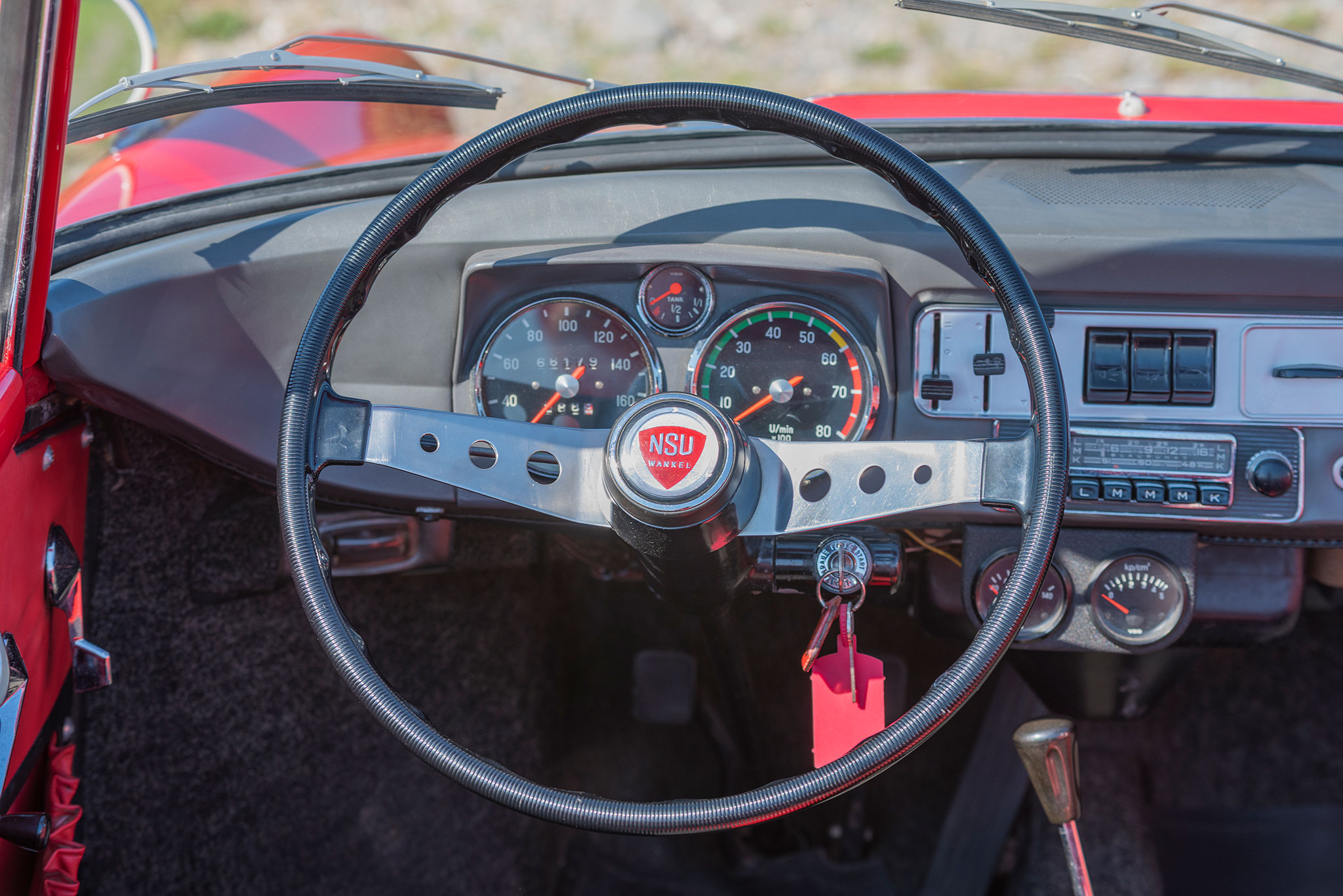 La NSU Wankel Spider se rapproche plus d’une microcar que d’un spider. Elle semble presque être un gros jouet pour enfant. Sa ligne est originale avec ses ailes arrière en pointe qui terminent un capot arrière proéminent. Lieu qui abrite le fameux moteur rotatif de 500 cm³. L’auto ne pèse que 700 kg et les 64 chevaux du moteur permettent – selon le constructeur – un 150 km/h en vitesse de pointe. C’est une stricte deux places. Outre le petit coffre avant, il y a derrière les sièges encore un peu de place pour quelques bagages. De couleur rouge vif avec des sièges rouge et noir, notre NSU Wankel Spider ne passe pas inaperçue. Le son du moteur non plus. Deux gros cadrans ronds pour le compte-tours et le tachymètre sont rehaussés par la jauge d’essence. L’eau et l’huile sont reléguées sous le tableau de bord.