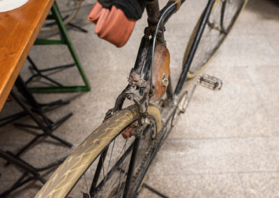 Le troisième vélo nous est présenté par David Lancosme d’AtelieREcycle. Et là, nous faisons un énorme bond dans le passé. C’est sûr, la machine à remonter le temps fonctionne. Ce vélo a presque 100 ans. En effet, il date de 1927. C’est un survivant du Tour de France. Oui, vous avez bien compris. Nous sommes face à un vélo qui a fait le Tour de France en 1927. Comme tous les vélos de cette époque, il y a deux vitesses. Chaque vitesse est, en fait, liée à un pignon. Un petit pour le plat et un grand pour les montées. Pour changer de vitesse, il suffisait de retourner la roue, laquelle est munie de papillons pour faciliter le changement. À noter qu’il existe toujours des courses, comme l’Eroica en Italie, qui rassemblent tous les passionnés de ce type de vélos.